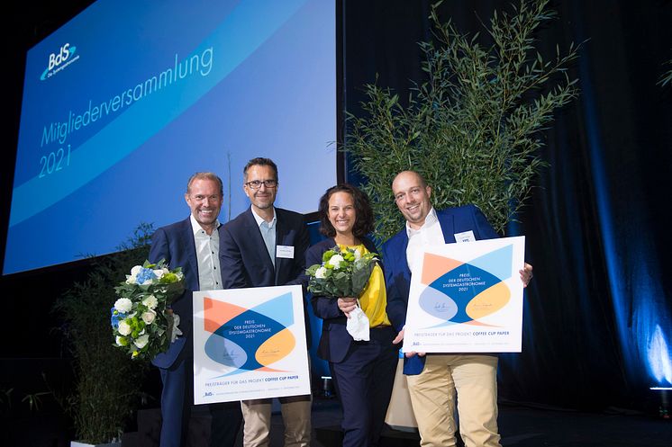Preisträger des Preises der Deutschen Systemgastronomie 2021 für das Projekt "Coffee Cup Paper" (Anika Wuttke, Torsten Gröger, Wolfgang Suerbaum und Andreas Simmen - Gemeinschaftsprojekt von Vertrieb IGEPA Großhandel GmbH und creart Neidhardt Werbe GmbH)