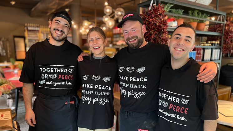 In Zeiten von Krieg, Gewalt und Hass – vor allem auch im Netz – möchte die L’Osteria La Famiglia ein deutliches Statement setzen. Dafür wurden eigens zwei Statement-Shirts entwickelt und produziert. Das Shirt gibt es in zwei Ausführungen: In der einen Variante prangt auf der Vorderseite die Botschaft MAKE PEACE – STOP HATE – ENJOY PIZZA, auf der anderen der Schriftzug Together for Peace and against Hate. Auf der Rückseite befindet sich das L’Osteria Logo und die ergänzende Botschaft We are La Famiglia. Die Shirts sind derzeit auf dem Weg in alle L’Osteria Restaurants und können in Kürze optional von den über 6.000 Mitarbeiter:innen der italienischen Markengastronomie getragen werden. Das Design sorgt dank L’Osteria typsicher Icons und Schriften für einen großen Wiedererkennungswert. Beim Schnitt der Shirts wurde darauf geachtet, dass sie während der Arbeit nicht einschränken und bequem sind. Sie bieten im lässigen Oversize-Look viel Bewegungsfreiraum und sind aufgrund ihrer Baumwollqualität auch bei heißen Temperaturen angenehm zu tragen.