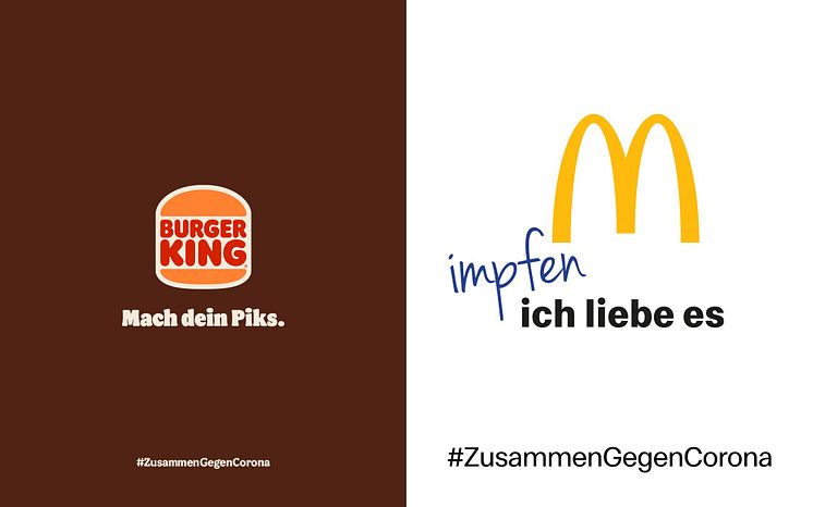Die insgesamt 150 Unternehmen, die an dieser Kampagne mitwirken, nutzen auch die sozialen Medien, um diese Aktion unter dem #ZusammenGegenCorona zu verbreiten. Markus Weiß, Unternehmenssprecher McDonald’s Deutschland LLC. erklärt, warum sich das Unternehmen daran beteiligt: „Ich empfinde es als ein starkes Zeichen, dass diese Bandbreite und Vielfalt an Unternehmen für solch eine starke Botschaft zusammengefunden hat. Denn Corona betrifft uns alle und nur gemeinsam können wir diese Herausforderung meistern. Die Aktion ist ein Zeichen der Solidarität, der Verantwortung und der Gemeinschaft. Es freut mich sehr, dass wir hier als McDonald’s einen Beitrag leisten konnten.“ Auch Daniel Polte, Manager Public Relations bei der BURGER KING Deutschland GmbH äußert sich begeistert: „Unsere wichtigste Chance im Kampf gegen Corona ist die Impfung. Nur, wenn wir alle gemeinsam an einem Strang ziehen und sich genügend Menschen impfen lassen, kann es uns gelingen, die vierte Welle zu brechen. Um mit dieser Botschaft noch mehr Menschen zu erreichen, hat sich Burger King® gemeinsam mit über 150 weiteren Unternehmen der Aktion #ZusammenGegenCorona angeschlossen. Mit unserem Claim „Mach dein Piks“ nutzen wir unsere hohe Reichweite und machen auf die Wichtigkeit der Impfung aufmerksam. Denn jede und jeder einzelne von uns kann einen Teil dazu beitragen, dass wir möglichst bald zu dem Alltag zurückzukehren können, wie wir ihn vor der Pandemie kannten."