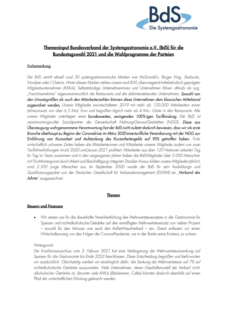 Bundestagswahl 2021: Kernforderungen des Bundesverbands der Systemgastronomie e. V. an die Politik