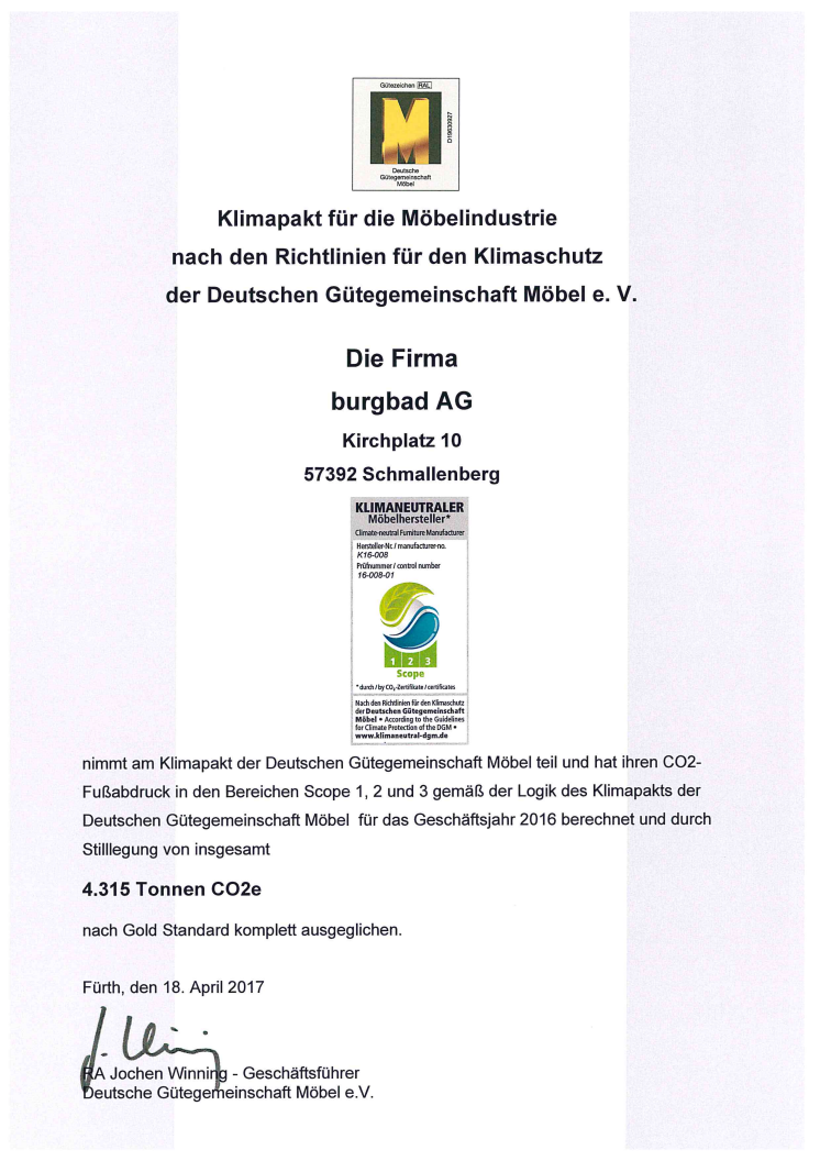 Als erster deutscher Badmöbelhersteller erhält burgbad das Label „Klimaneutraler Möbelhersteller“ der Deutschen Gütegemeinschaft Möbel (DGM).