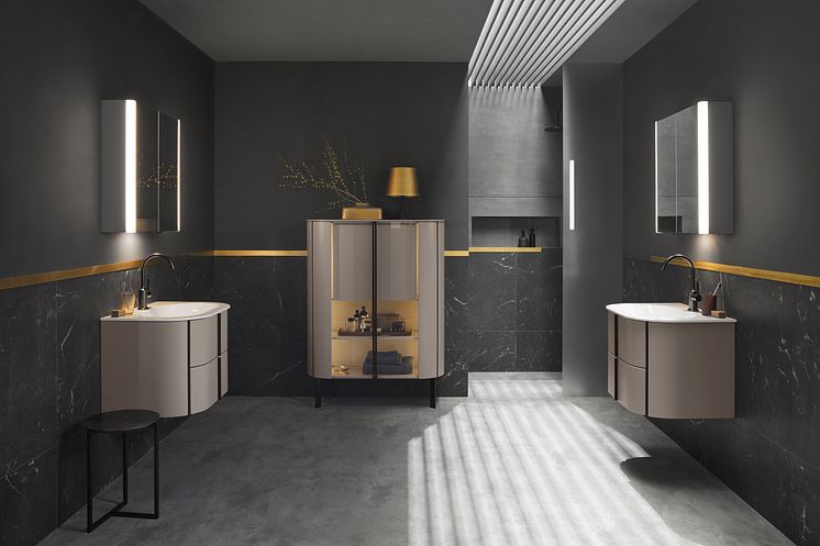 Die neue Kollektion Lavo 2.0 von burgbad macht das Bad zum Salon: Eine elegante Formensprache rund ums Oval, hochwertige Oberflächen, Konsolen und Highboards sowie eine stimmungsvolle Akzent-Beleuchtung sorgen für ein emotionales Ambiente im modern interpretierten Mid Century Style – hier in Basalt Grau Matt mit Mineralguss-Flächenwaschtischen, Spiegelschränken und Highboard mit Innenschrank. (Foto: burgbad)