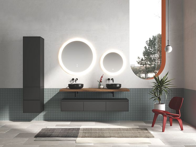 Auf der ISH 2023 stellt burgbad ein neues Stauraumkonzept für rc40 Solitaire vor. Die Schränke des Programms erhalten ein spektakuläres Update: Dank eines geschwungenen Führungssystems können die Hoch- oder Seitenschränke ihr Inneres um die eigene Achse komplett nach außen drehen und ermöglichen damit einen komfortablen Zugriff auf die hinten liegenden Bereiche des Schranks – und damit auch auf jene Flaschen, Körbe und Utensilien, die bislang immer im Dunkeln geblieben sind. (Foto: burgbad)
