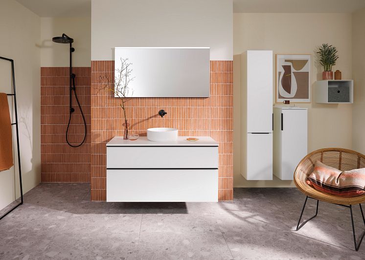Einfach schlicht und elegant: Die neuen Konsolenlösungen mit runden oder rechteckigen Aufsatzwaschtischen in Keramik aus der mit dem Blauen Engel zertifizierten Bestseller-Kollektion Eqio von burgbad machen den Waschplatz zur Bühne – jetzt auch in trendbewusstem Weiß Matt und mit minimalistischen Griffleisten in Frontbreite. (Foto: burgbad)