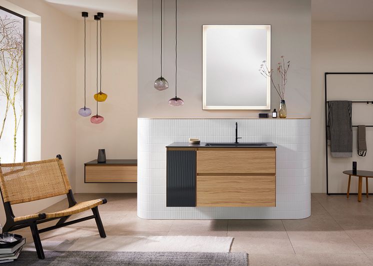 Zeitlos und modern: Die Badmöbelserie Accura von burgbad schafft eine perfekte Symbiose aus geradlinigem Design und Trendbewusstsein in handwerklicher Qualität. Auf Gehrung gearbeitet und mit hochwertigen Oberflächen ausgestattet – hier in Echtholzfurnier Eiche Natur mit modernem Akzent durch die dunkelgraue Rillenglastür – schafft Accura ein wohnliches, elegantes Ambiente. Der Leuchtspiegel kann im Hochformat oder quer montiert werden. (Foto: burgbad)