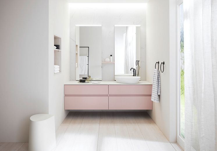 Klare Linie mit sys30 von burgbad: Das maßflexible und umfangreichste All-in-One-Badplanungstool am Markt erhält mit durchgehend grifflosen Fronten eine ganz neue, puristische Optik. Die in die Front integrierten Griffmulden vereinen komfortable Bedienung und klares Design – hier in der ins Rosé gehenden Trendfarbe Sandstein. Foto: burgbad