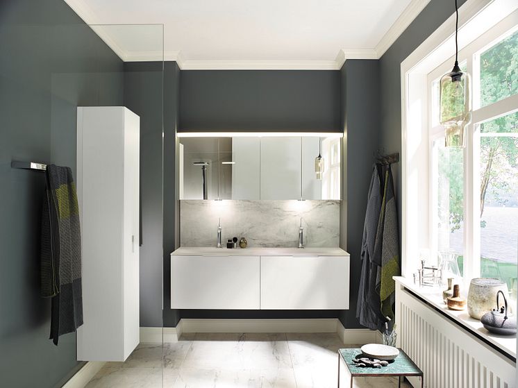 Steht für burgbads Idee maßflexibler Lösungen im Badezimmer und trägt seit 30 Jahren das „Goldene M“ für Qualitätsmöbel: das Systemprogramm sys30 – hier als Programmvariante Aqua in Weiß Matt. (Foto: burgbad)