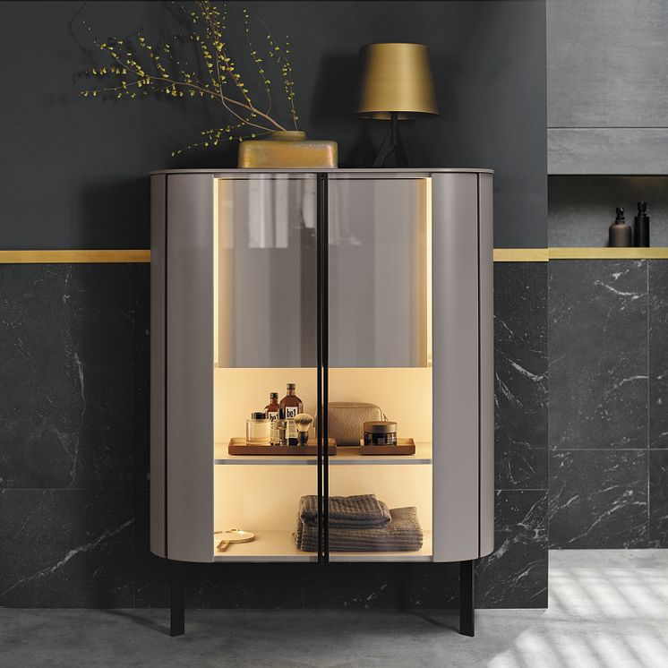 Sorgt für stimmungsvolles Licht – nach außen wie nach innen: Der weich abgerundete Vitrinenschrank aus der neuen burgbad-Kollektion Lavo 2.0 (hier in Basaltgrau Matt) zeigt nur zum Teil, was in ihm steckt – der Rest ist hinter den Türen des optional wählbaren Innenschranks wohl geborgen. (Foto: burgbad)