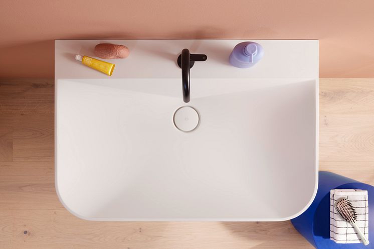Neu designter Mineralguss-Waschtisch: Weiche Rundungen, wie von der Natur geformt, gehen in eine klare, grafische Kantenführung über. Studio Besau-Marguerre ließ sich durch die weiche Haptik des Materials zu einer Form inspirieren, die Assoziationen an Sanddünen wie an ein gefaltetes Papier weckt und durch Licht und Schatten immer wieder neu moduliert wird. (Foto: Anne Deppe; burgbad)