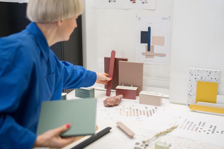 Die Materialbibliothek von burgbad: In einem Workshop wurden alle Dimensionen von Material, Farbe und Formen zusammengefügt und in von Besau-Marguerre entwickelte Farbwelten eingeordnet. Foto: Tim Kaiser; burgbad