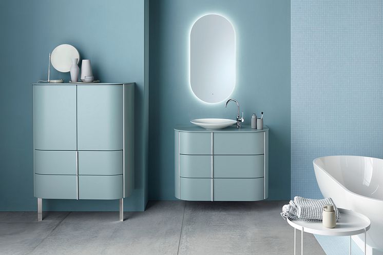 „Echte“ Möbel für das Bad: Ästhetisch überzeugend verbindet die neue Kollektion Lavo 2.0 von burgbad das Rechteck mit dem Oval und den Waschtisch mit dem Möbel. Trendige Oberflächen – hier in frischem, skandinavisch angehauchtem Eisblau Softmatt – und Farbvarianten für Griffleisten und Füße (wie hier in Chrom) setzen Akzente in dieser zwischen geradlinigem Minimalismus und charmantem Mid Century Style angesiedelten Kollektion aus der Designlinie Sys20. (Foto: burgbad)