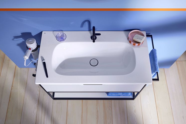 Cleveres Zubehör: Haken, Fön-Halter und Handtuchstange lassen sich ganz nach Geschmack individualisieren und nach Bedarf immer wieder umorganisieren – einfach an der seitlichen Metallstrebe positionieren und befestigen. (Foto: burgbad)