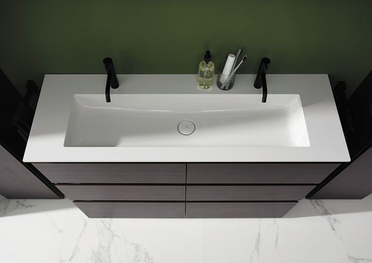 Extra breit mit extra viel Volumen: Die 140 cm breite Waschtischeinheit mit Mineralguss-Flächenwaschtisch aus der neuen burgbad-Kollektion Lin20 von burgbad (hier in Eiche Dekor Mokka) hat zwei Armaturbohrungen und eine besonders breite Kumme.