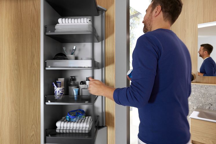 Stauraum-Komfort mit Wow-Effekt: Beim Hochschrank MagicTwist von burgbad öffnet sich der obere Teil im Handumdrehen zum attraktiven Regal, in dem alles für die Körperpflege griffbereit in Augenhöhe bereitsteht. Mit einem Schwung verschwindet alles wieder hinter der minimalistischen Schrankfront. Foto: burgbad