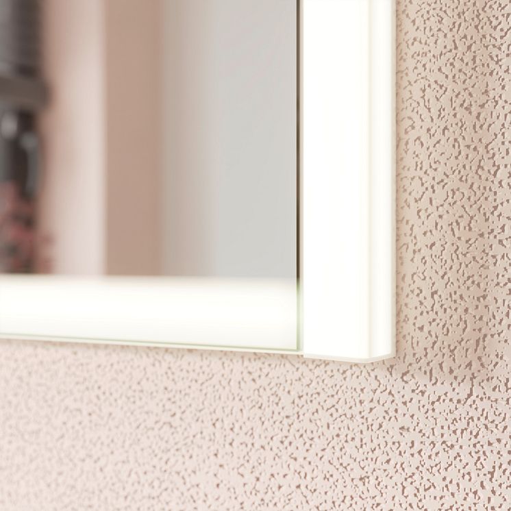 Elegante Spiegeltüren mit Klarglas-Ausschnitt: Der neue Spiegelschrank rl20 von burgbad, ausgezeichnet mit dem RAL-Gütezeichen „Möbel Zirkulär Nachhaltig“, hat eine umlaufende LED-Beleuchtung ganz ohne die üblichen Verschattungseffekte in den Ecken und ist auch als Einbauvariante erhältlich. Foto: burgbad