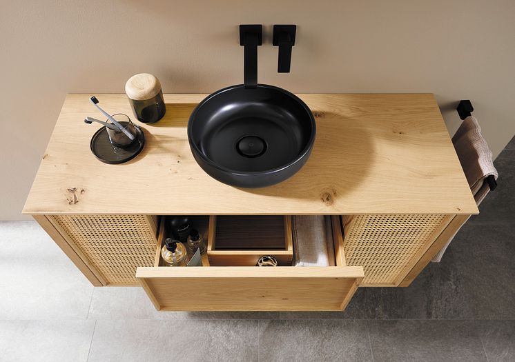 Zeitlose Waschtische in Holz und Keramik: Die wandhängenden oder bodenstehenden Echtholzschränke der neuen burgbad-Kollektion Max (hier in Asteiche Natur) lassen sich mit Flächenwaschtischen oder Aufsatzbecken (Weiß oder Schwarz Matt) in Keramik kombinieren. (Foto: burgbad)