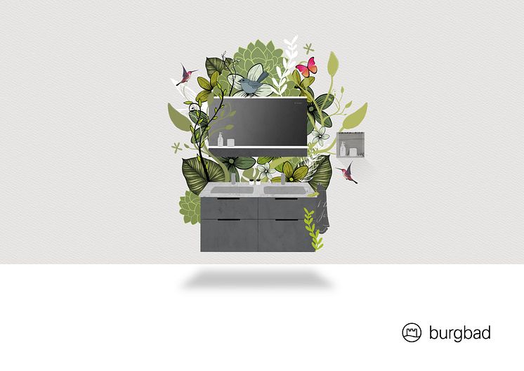 Das Bestseller-Programm Eqio – 2020 ausgezeichnet mit dem von der Bundesregierung herausgegebenen Umweltsiegel „Blauer Engel“ – steht für burgbads Anspruch, konsequent nachhaltige Möbel zu produzieren. (Illustration: Björn Steinmetzler; burgbad)