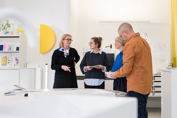 Workshop bei Besau-Marguerre: burgbad hat zusammen mit den Hamburger Designern eine Materialbibliothek erarbeitet, die Kollektionen, Material- und Farb-Optionen miteinander kombiniert und in von Besau-Marguerre entwickelte Farbwelten einordnet. V.l.n.r.: Sabine Meissner und Jennifer Albrecht (burgbad), Eva Marguerre und Marcel Besau. Foto: Tim Kaiser; burgbad