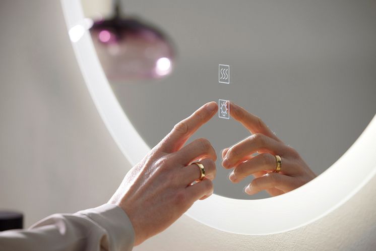 Elegante Ergänzung: Der neue, kreisrunden LED-Leuchtspiegel von burgbad, ausgestattet mit komfortabler Spiegelheizung und Sensorschalter, wirkt für sich. Als Gegenpol zu dem geradlinigen Design der sys20-Designlinie Accura bringt er Spannung in das kunstvolle Gesamtbild vom Waschplatz. (Foto: burgbad)