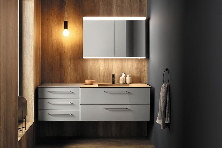 Authentische Optik und zeitgemäßes, pflegeleichtes Material: Das Systemprogramm sys30 von burgbad bietet Planern mit dem neuen Compact-Waschtisch aus HPL – hier in Eiche Dekor Antik in Kombination mit Thermoform-Unterschrankelementen der Systemlinie Echo in Leinengrau Hochglanz – eine interessante Alternative zu Mineralguss, Glas oder Keramik (Foto: burgbad)