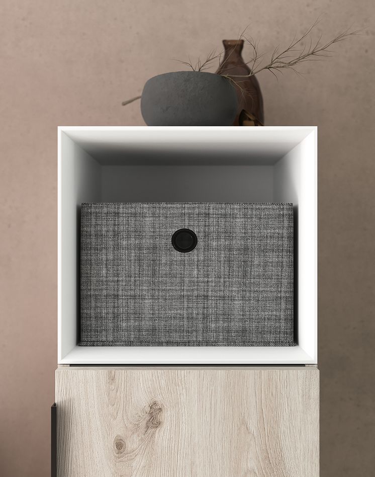 Neues Accessoire bei Eqio: Der Korb in stabilem Stoff passt perfekt in die Hochschränke (hier in der neuen Oberfläche Eiche Deko Silber) oder in das offene, mattweiße Regalfach der Bestseller-Kollektion Eqio von burgbad, die nicht nur für ein besonders attraktives Preis-Leistungs-Verhältnis, sondern auch für eine einfache Produktstruktur bei hoher Individualisierbarkeit, eine trendgerechte Ästhetik und ihre schnelle Verfügbarkeit bekannt ist. (Foto: burgbad)