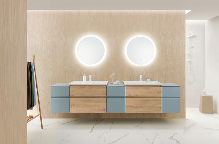 Modulares Programm: Die scheinbar nahtlos aneinander reihbaren Auszugsschränke der neuen Kollektion Lin20 von burgbad lassen sich monochrom oder im Colour-Blocking zu individuellen Arrangements zusammenstellen. Verbindendes Element ist die durchgehende Horizontallinie des grifflosen Möbeldesigns. Sowohl die Aufsatz- als auch die Flächenwaschtische sind dabei bewusst etwas höher platziert als die seitlichen Anbauschränke.