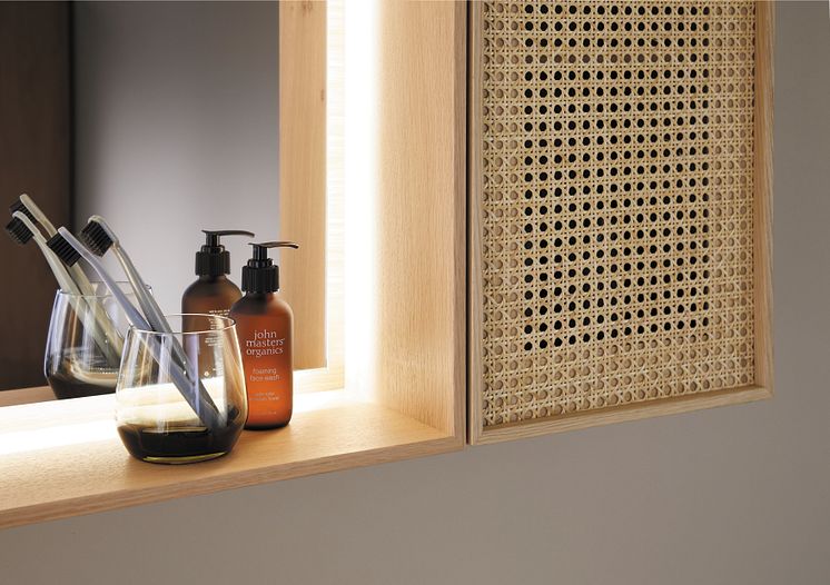 Echtholzkollektion Max von burgbad: Der in seiner Lichttemperatur steuerbare Leuchtspiegel mit umlaufender LED-Beleuchtung lässt sich durch Hängeschränke (Türen mit Rahmenfronten oder mit Wiener Geflecht) modular erweitern. (Foto: burgbad)