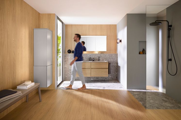 Der MagicTwist-Hochschrank von burgbad stellt individuellen Stauraum genau dann zur Verfügung, wenn man ihn braucht. Danach schließt sich das oben integrierte Regal wie von Zauberhand wieder hinter der minimalistischen Schrankfront. Dank des innovativen Drehbeschlags macht das Öffnen und Schließen immer wieder Freude. Foto: burgbad
