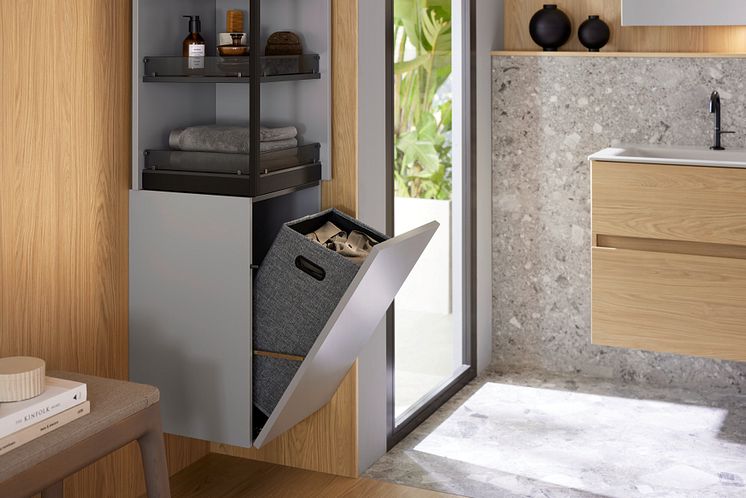MagicTwist bietet clevere Stauraumlösung: Der innovative Hochschrank MagicTwist von burgbad erschließt platzsparend den Stauraum in diversen Einbau- und Grundriss-Situationen, ohne dass dabei offene Türen im Weg stehen. Während sich der obere Teil vom geschlossenen Schrank in ein offenes Regal verwandeln lässt, ist unten eine Wäschekippe mit Stoffkorb integriert. Foto: burgbad