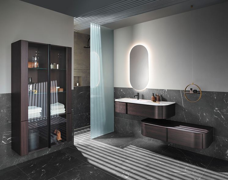 Klassisch & gediegen – und dennoch außergewöhnlich: Das Lavo 2.0-Ensemble in Eiche Dekor Mokka mit versetzt wandmontiertem Waschtisch und Sideboard schafft luftige Spannung und viel Platz zum Dekorieren – genauso wie die zwei Hochschränke mit Vitrinentüren. (Foto: burgbad)