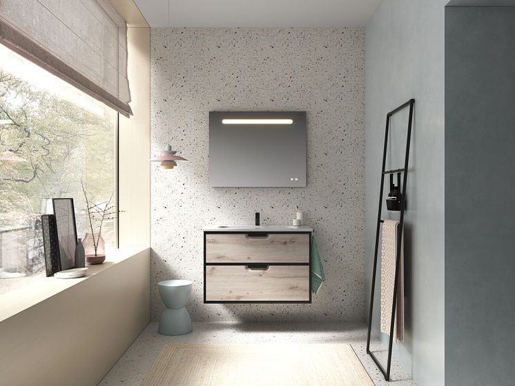 Vry – überraschend smart in Design & Funktion, überraschend günstig in Verfügbarkeit & Preis. Die neue Kollektion des Badmöbelspezialisten burgbad aus dem Schnelllieferprogramm sys10 überzeugt mit hochwertigen Elementen wie Alurahmen und filigranem Keramikwaschtisch – und ist innerhalb weniger Tage da. Hier in Eiche Dekor Silber. (Foto: burgbad)