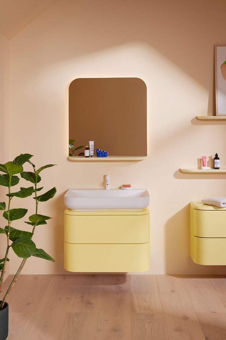 Waschtisch mit Taille: Flächenwaschtisch oder Aufsatzschale? Der Mineralguss-Waschtisch der neuen Badserie b:me von burgbad bietet viel Platz und wirkt doch so objekthaft wie ein Aufsatzwaschtisch. Das Rundfronten-Design der in hochwertigen Lackoberflächen gearbeiteten Schränke, Sideboards, Ablagen und Leuchtspiegel lässt die Übergänge zu den anderen Wohnbereichen verschwimmen. (Foto: Anne Deppe; burgbad)