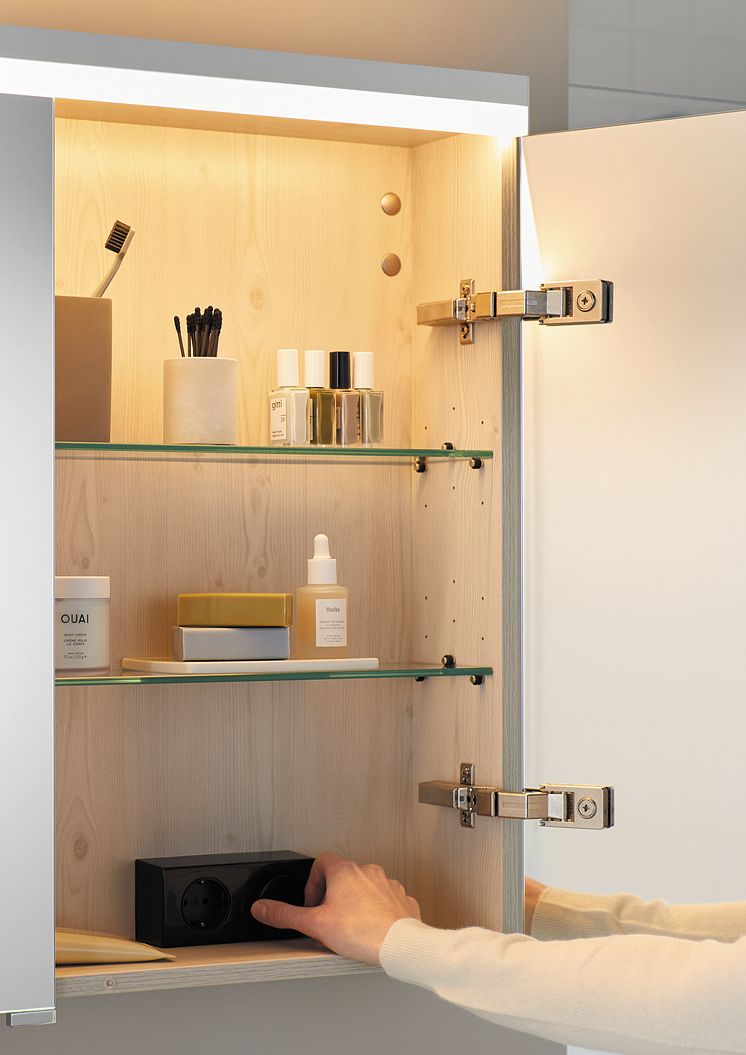 Das neue Beleuchtungskonzept des Spiegelschranks mit horizontaler LED-Beleuchtung sorgt für blendfreies, dimmbares und zwischen Warm- und Kaltweiß stufenlos regelbares Licht nach vorne, nach innen und als indirekte Deckenbeleuchtung nach oben.