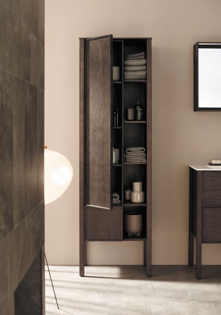 Max überträgt traditionelle Formensprache in die Moderne: Die an alte Garderobenschränke erinnernden Hochschränke der Echtholz-Kollektion Max von burgbad – hier in breiter Ausführung mit Tür und seitlichem, offenem Regal – gibt es in drei Breiten- und zwei Farbvarianten (hier Eiche Dark Chocolate). (Foto: burgbad)