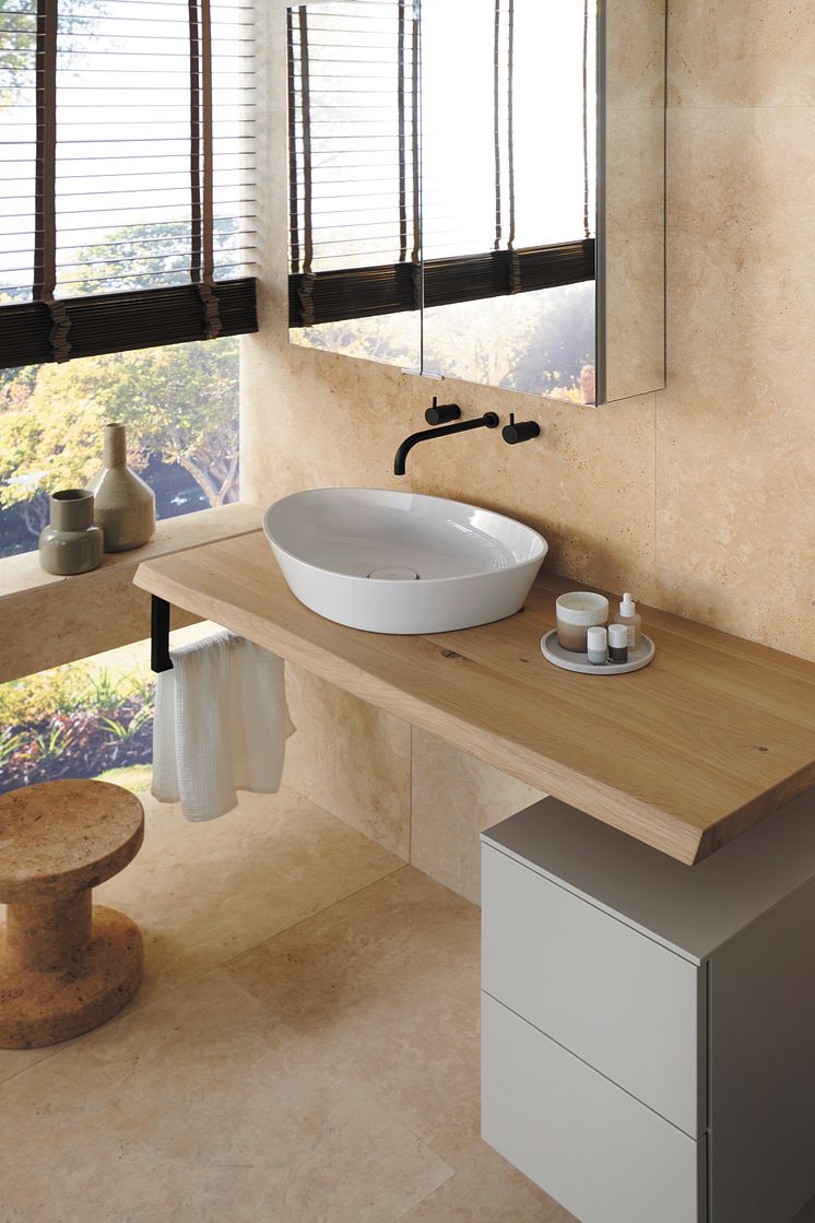 Neu bei dem Alleskönner-Programm sys30 von burgbad sind echte Massivholzkonsolen in Eiche Natur oder Eiche Honig mit besonders natürlich wirkender „Baumkante“ – hier kombiniert mit einem neuen, amorph geformten sys30-Aufsatzwaschtisch und einem Schrank der sys30-Systemlinie Diago in Sand Matt . (Foto: burgbad)