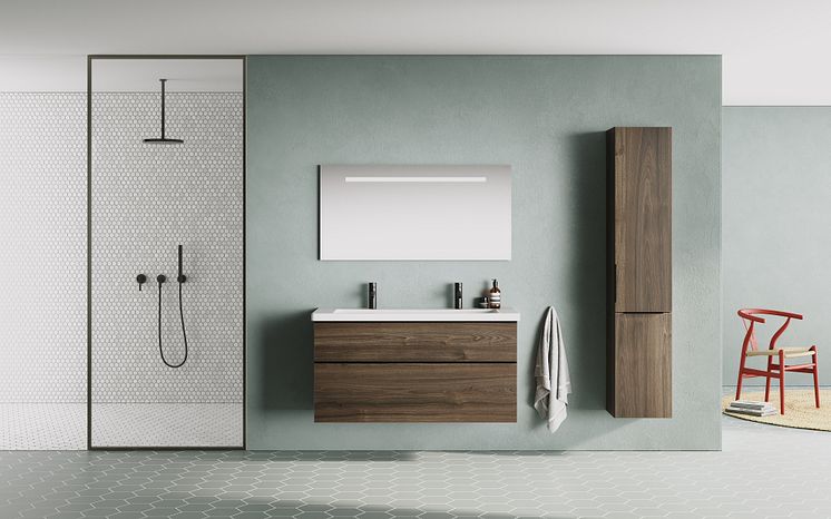 Update für burgbads Allrounder-Programm: Eqio – hier in Marone Dekor Trüffel mit den neuen, frontbreiten Griffleisten in Schwarz Matt – hat sich als universell einsetzbare Badmöbelkollektion bewährt, die sich in kleine wie große Bäder sowie in unterschiedlichste Stilwelten einfügt und dabei ein ungewöhnlich gutes Preis-Leistungs-Verhältnis einhält. Der Blaue Engel garantiert zudem, dass Eqio nur Holz aus nachhaltiger Forstwirtschaft enthält, emissionsarm und in der Wohnumwelt gesundheitlich unbedenklich ist. (Foto: burgbad)