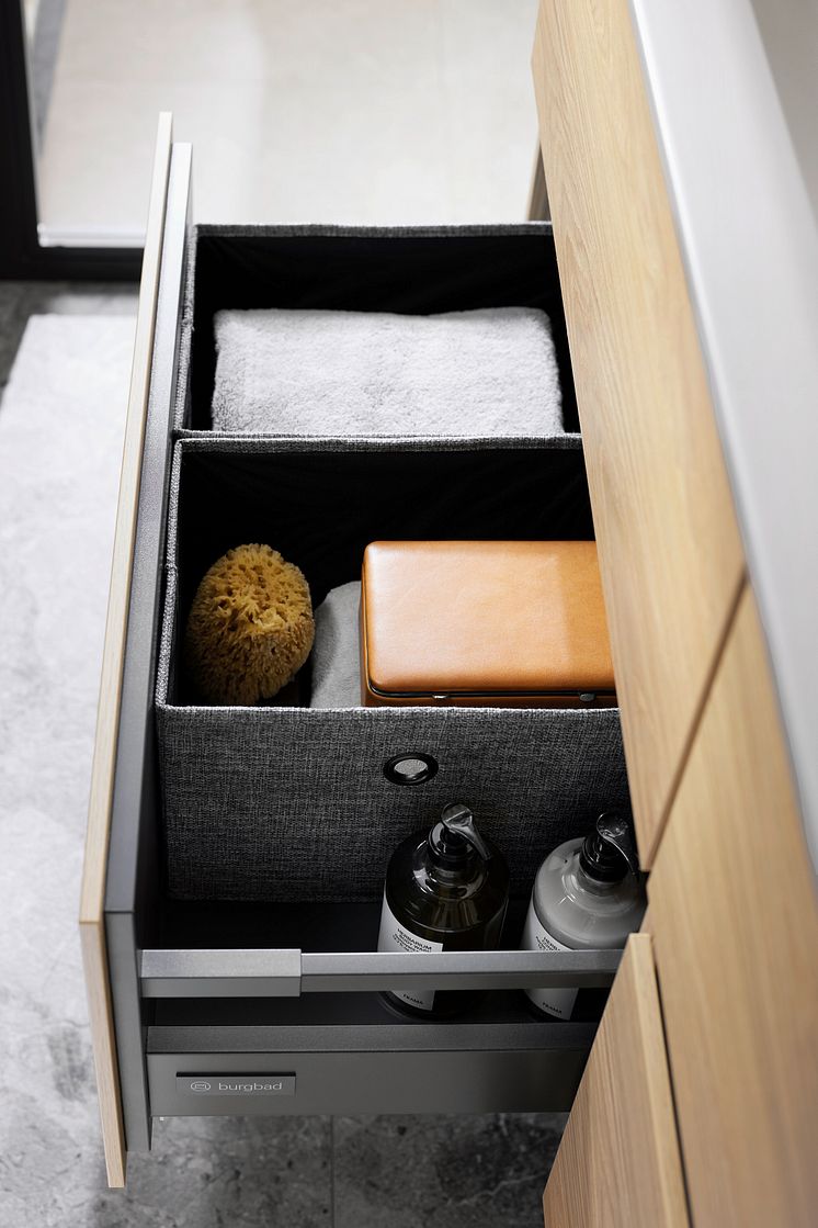 Geradlinig, schnörkellos und praktisch: Die neuen „grifflosen“ Fronten des Systemprogramms sys30 von burgbad lassen sich ergonomisch über verdeckte, Front-breite Griffmulden öffnen (hier in Eiche Dekor Klassik). Dank hochwertiger Beschläge ist die Bedienung sehr komfortabel. Dahinter verbirgt sich vor allem eins: viel Platz. Foto: burgbad