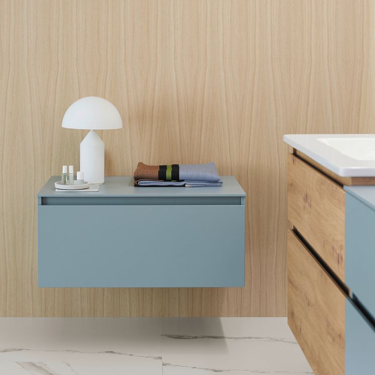 Solitäres Ergänzungsmöbel in der neuen Kollektion Lin20 von burgbad ist das Sideboard (hier in Eisblau Matt).