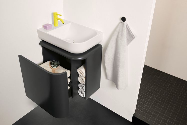 Softes Design für ein elegant-knuffiges Mini-Bad: Der vernünftig dimensionierte Gästebad-Waschtisch aus der neuen burgbad-Kollektion b:me (Design: Besau-Marguerre) spart nicht nur Platz, sondern bietet auch Stauraum im patenten Unterschrank – ideal für urbane Kleinbäder oder Bäder im Tiny House-Stil. (Foto: Anne Deppe; burgbad)