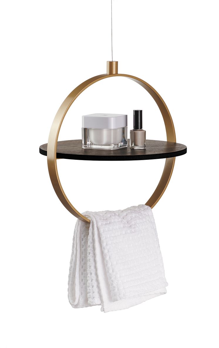 Pendelablage (Nussbaum Dekor) mit goldfarbenem Metallring: Lavo 2.0 von burgbad wartet mit überraschend trendaffinem Zubehör auf. (Foto: burgbad)