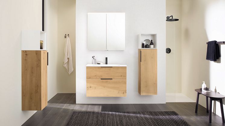 Einfach, praktisch, gut: burgbads Allrounder-Programm Eqio (hier in Eiche Dekor Urban) hat sich als universell einsetzbare Badmöbelkollektion bewährt, die sich in kleine wie große Bäder sowie in unterschiedlichste Stilwelten einfügt und dabei ein ungewöhnlich gutes Preis-Leistungs-Verhältnis einhält. Der Blaue Engel garantiert zudem, dass Eqio nur Holz aus nachhaltiger Forstwirtschaft enthält, emissionsarm und in der Wohnumwelt gesundheitlich unbedenklich ist. (Foto: burgbad)
