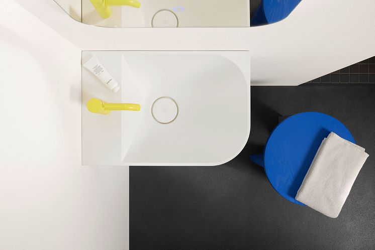 Pure Geometrie mit weichen Rundungen: Dank seitlicher Hahnlochbank und komfortabel dimensionierter Tiefe funktioniert das für die Ecke konzipierte Gästebadmodell auch als kompakte Kleinbad-Lösung. Der Mineralguss-Waschtisch der neuen Designerkollektion b:me von burgbad zeigt dabei die gleiche markante, von weichen Sandformationen und gefaltetem Papier inspirierte Formsprache wie die Modelle in Standardgröße. (Foto: Anne Deppe; burgbad)