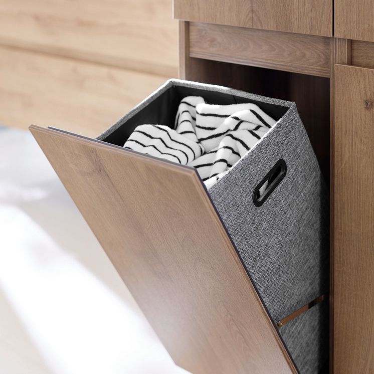 Integratives Design mit praktischen Details: Der im Hochschrank des maßflexiblen Systemprogramms sys30 von burgbad eingesetzte Wäschekorb wird über eine Front-breite Griffmulde komfortabel geöffnet (hier in der Oberfläche Eiche Dekor Caramel). Foto: burgbad