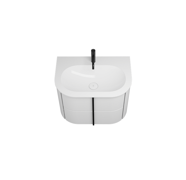 Schlichtes Oval für einen Klassiker: Waschtischeinheit mit Mineralgusswaschtisch und Unterschrank mit zwei Auszügen in weich gerundeter Thermoformfront in Weiß Matt. (Foto: burgbad)