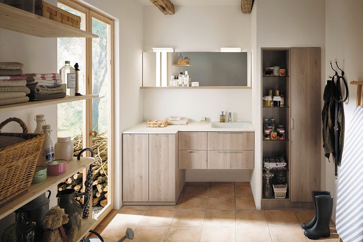 Optimal dem Raum angepasste Einrichtung und individuell konfigurierter Stauraum: Das Alleskönner-Programm sys30 von burgbad findet für jede Herausforderung eine Lösung – hier mit einer Waschmaschinen-Lösung und einem Einbau-Wunschrank. (Foto: burgbad)