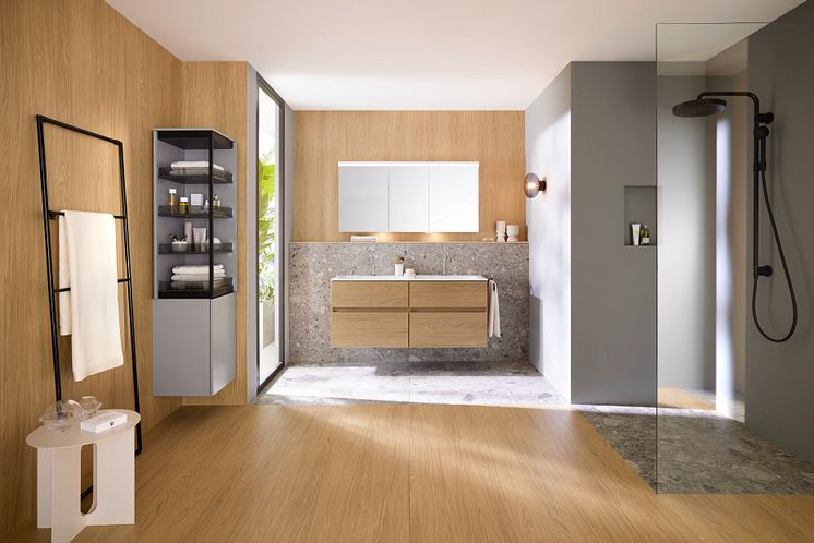 Auch besondere Extras wie der neue Hochschrank MagicTwist – hier in Perlgrau Solid Matt zusammen mit einem Waschtischunterschrank mit Griffmulden-Fronten in Eiche Dekor Klassik – sind Teil des exklusiven Systemprogramms sys30 von burgbad. MagicTwist ist ein Verwandlungskünstler, der dank einer innovativen Drehbeschlagtechnik einen geschlossenen Schrank im Handumdrehen in ein offenes Regal verwandelt und so den Stauraum bis in den hintersten Winkel komfortabel erschließt. Foto: burgbad