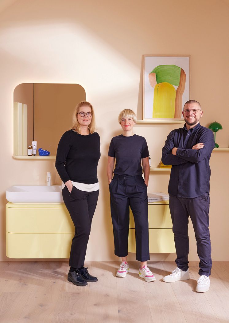 Mit der vom Studio Besau-Marguerre gestalteten Serie b:me setzt burgbad seine Reihe an Designerkollektionen fort. Marketingleiterin Sabine Meissner (links) freut sich über die gute Zusammenarbeit mit Eva Marguerre und Marcel Besau, die das burgbad-Sortiment um eine ungewöhnlich wohnliche, heitere und feminine Kollektion bereichert. (Foto: Anne Deppe; burgbad)