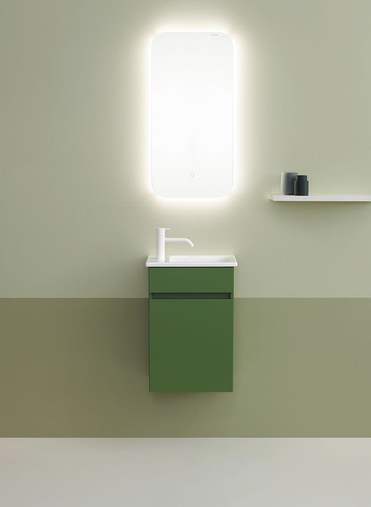 Minimalistisch im Design, extrovertiert in der Farbgebung: Die Gästebad-Lösung der neuen burgbad-Kollektion Lin20 lässt sich mithilfe einer reichen Oberflächen- und Farbpalette akzentstark individualisieren – etwa kontrastreich mit der Trendfarbe Moosgrün zum Waschtisch (hier in Keramik).