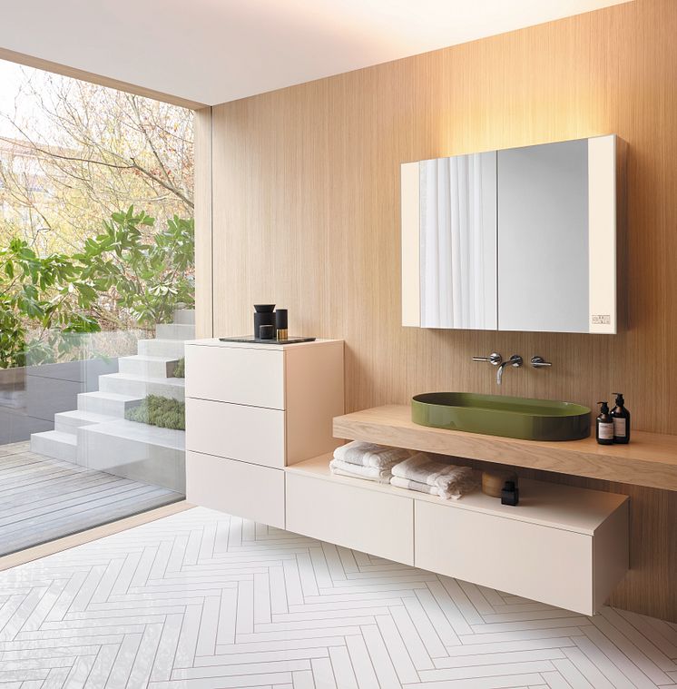Waschtisch-Konsollösungen sind angesagt und lassen sich gut mit Sideboards und halbhohen Schrankelementen kombinieren. Das modular aufgebaute Möbelsystemprogramm rc40 von burgbad bringt Wohnlichkeit ins Badezimmer. (Foto: burgbad)