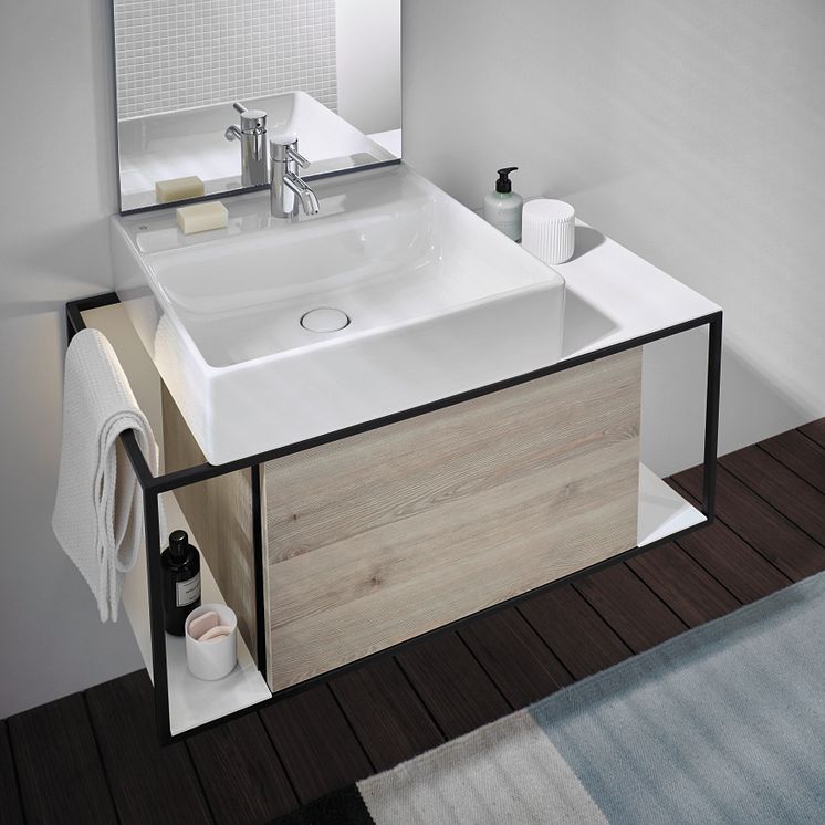 Waschtischeinheit mit Mehrwert: offener Aluminiumrahmen kombiniert mit geschlossenem Stauraum und offenen Ablagen. (Foto: burgbad)